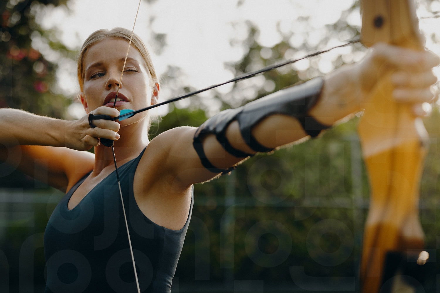 A professional female archer with a bracer focuses intently while aiming her bow. The image captures the concentration and dedication in the art of archery.
