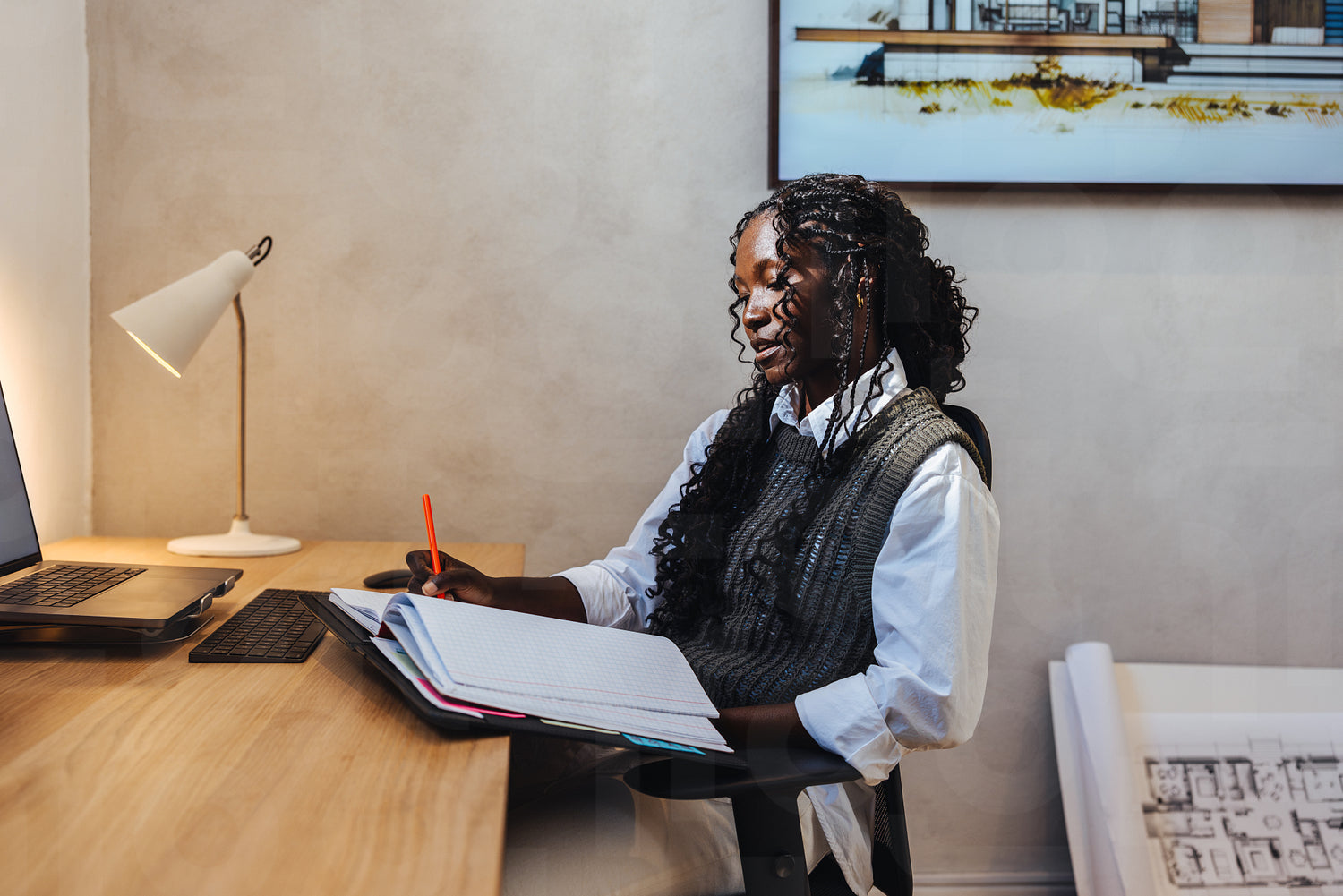 Young female architect working on a project, showcasing creativity and focus, seated at her desk.