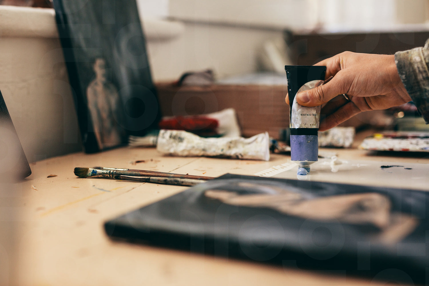 Close up of female artist hands with colors. Cropped shot of woman getting paint from tube in her studio.