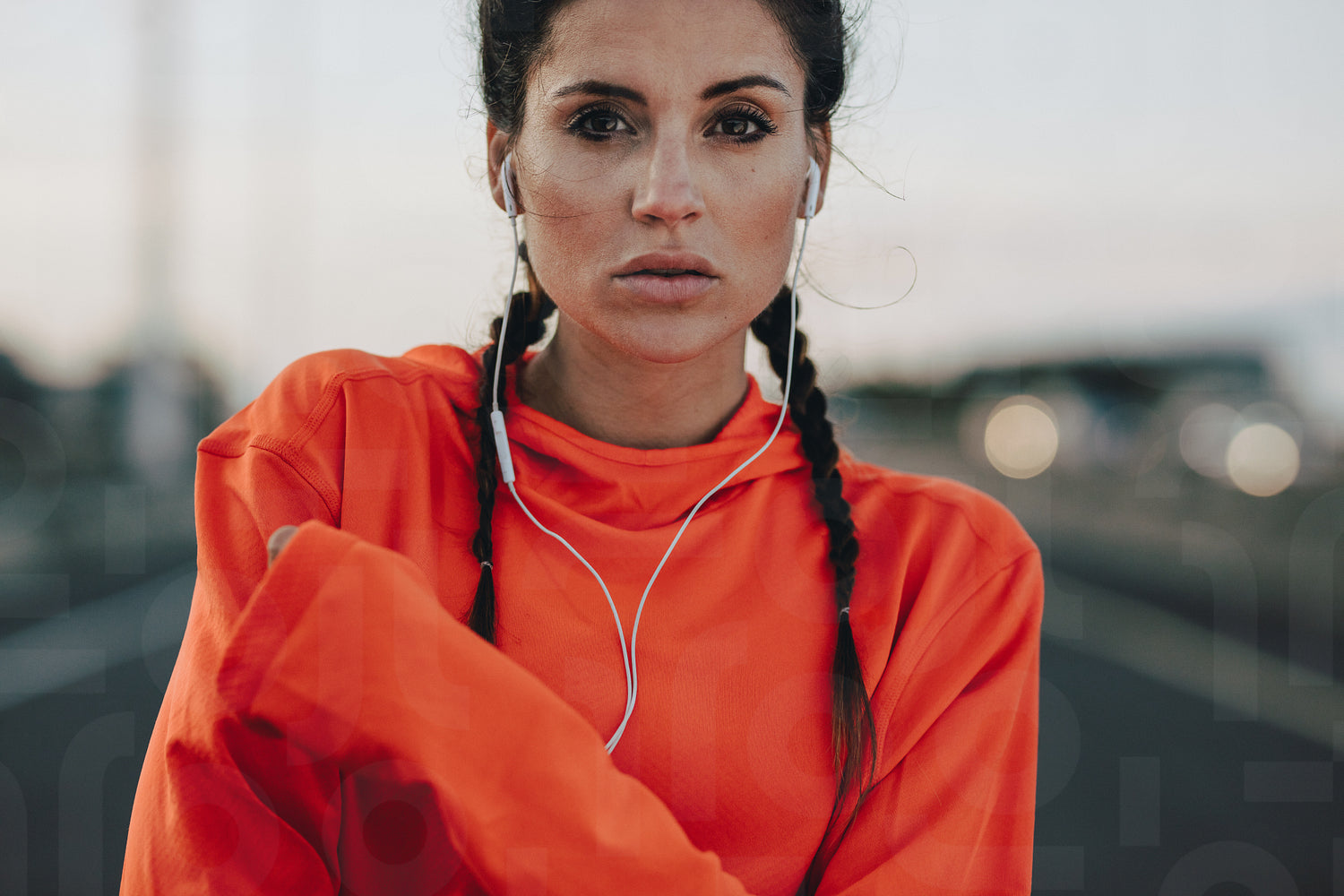 Close up of female athlete relaxing during workout standing outdoors. Fitness woman doing exercises outdoors and listening to music with earphones.