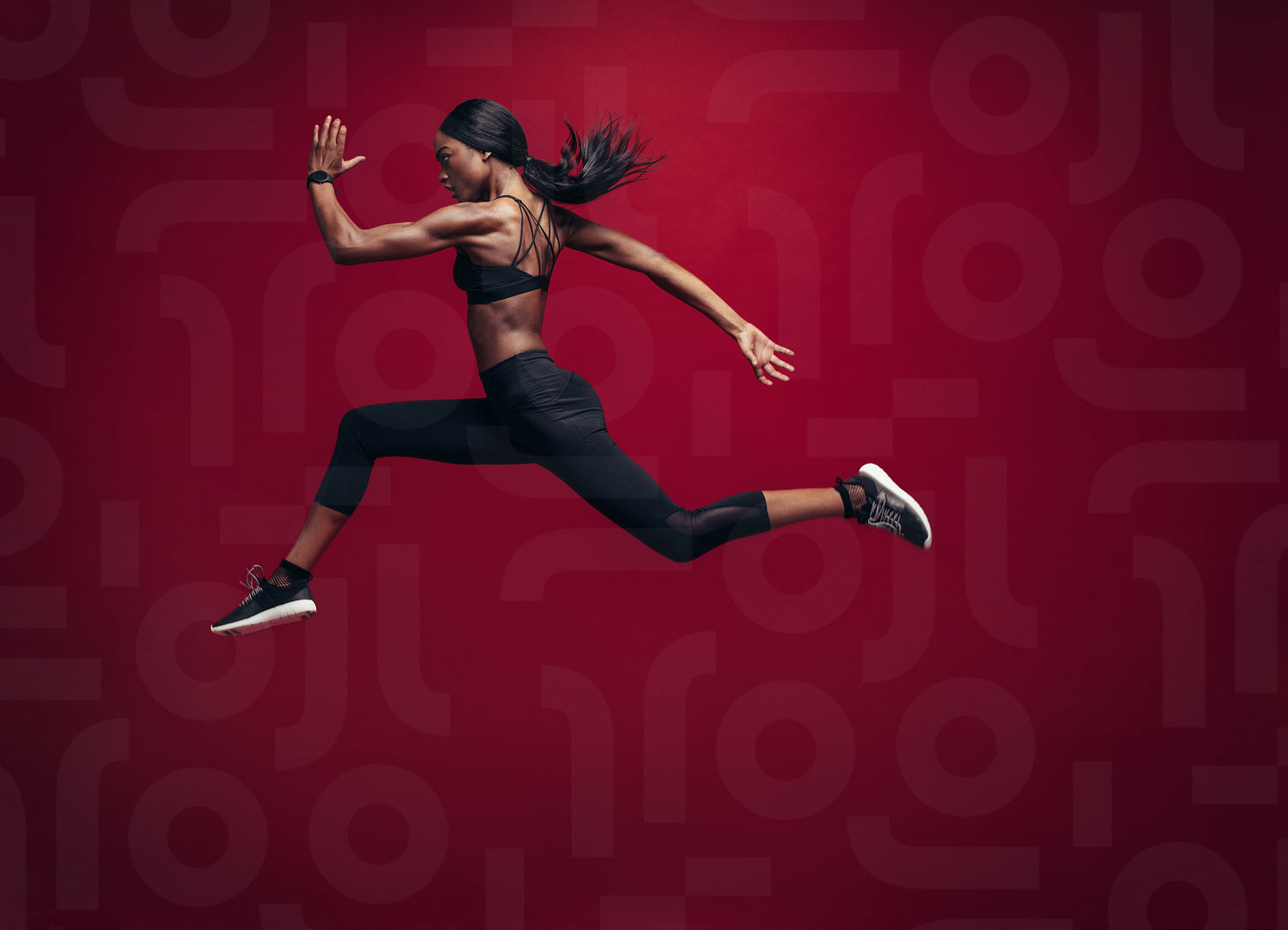 Female athlete running and jumping. Side view shot of healthy african woman working out against red background.