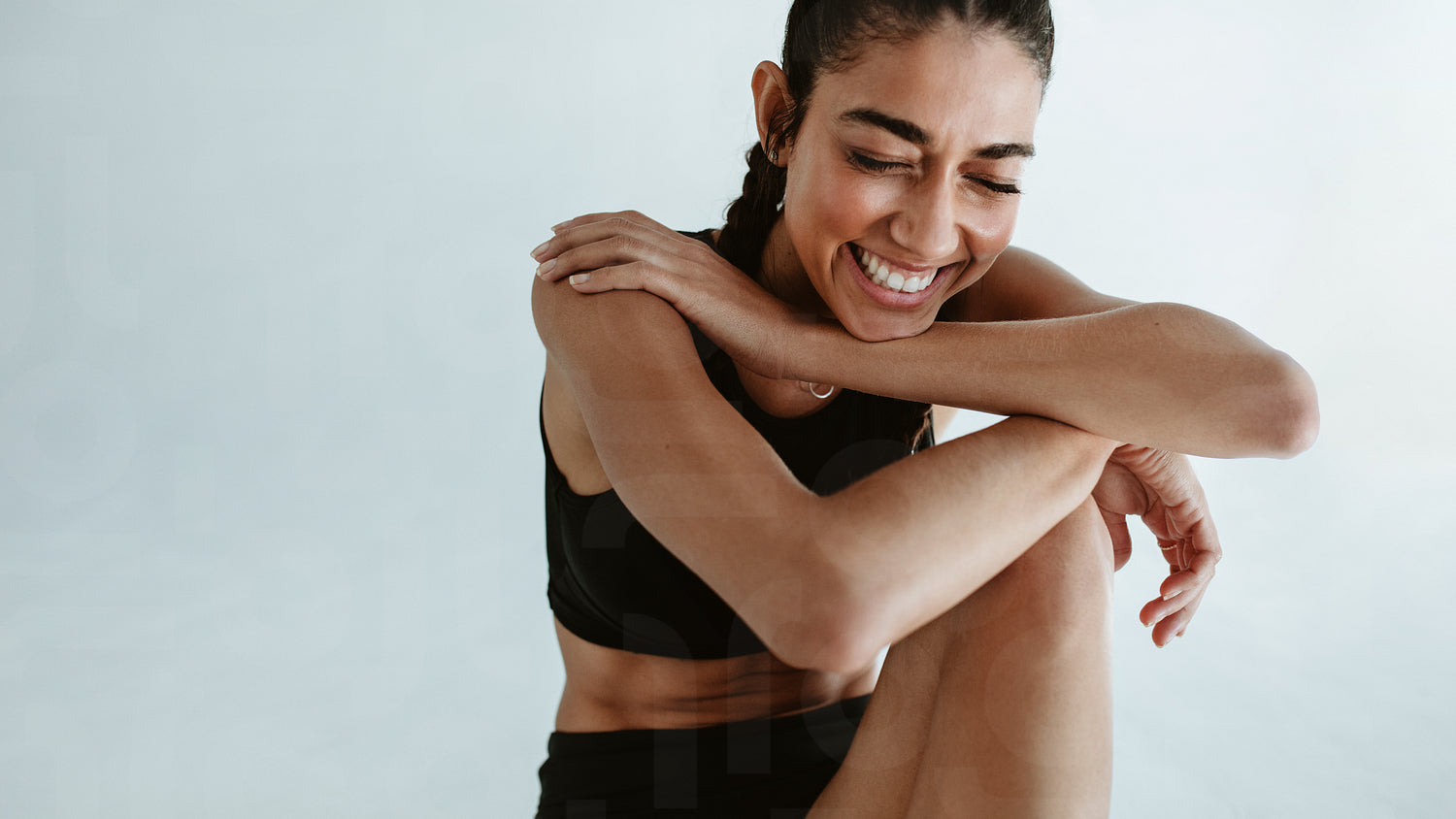 Healthy woman relaxing after workout and smiling. Female athlete taking a break from workout.