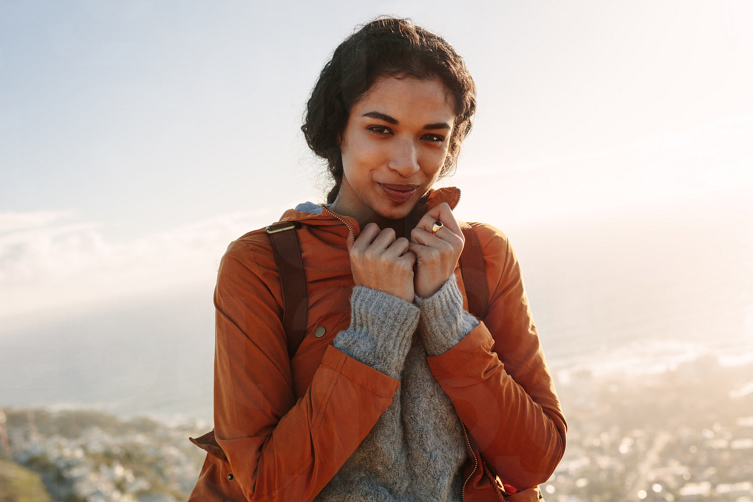 Portrait of young african woman in warm clothing standing outdoors and shivering. Female on hiking trip on cold winter day.