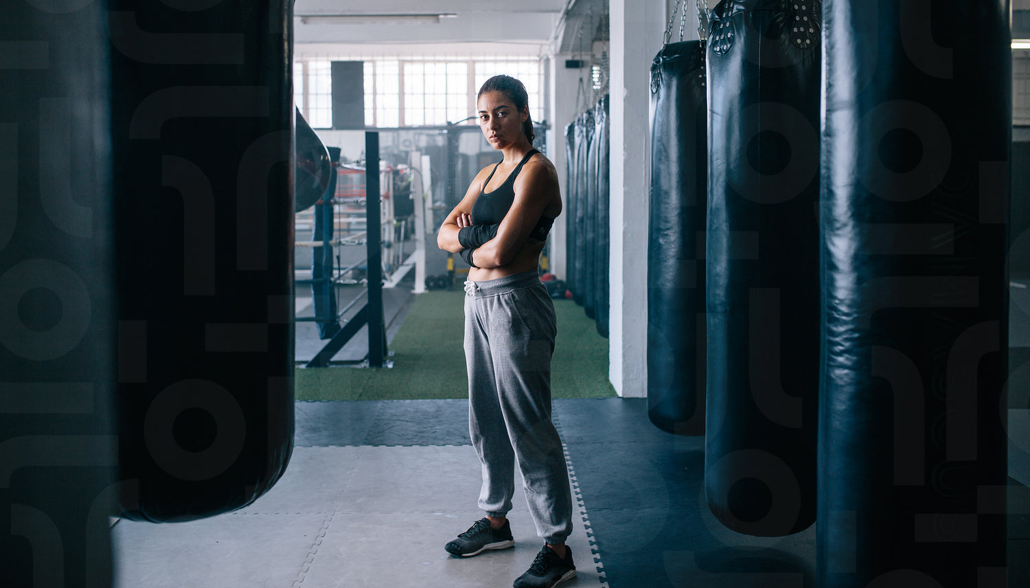 Woman standing in a boxing training centre with punching bags all around. Female boxer standing inside a boxing studio with her hands folded.