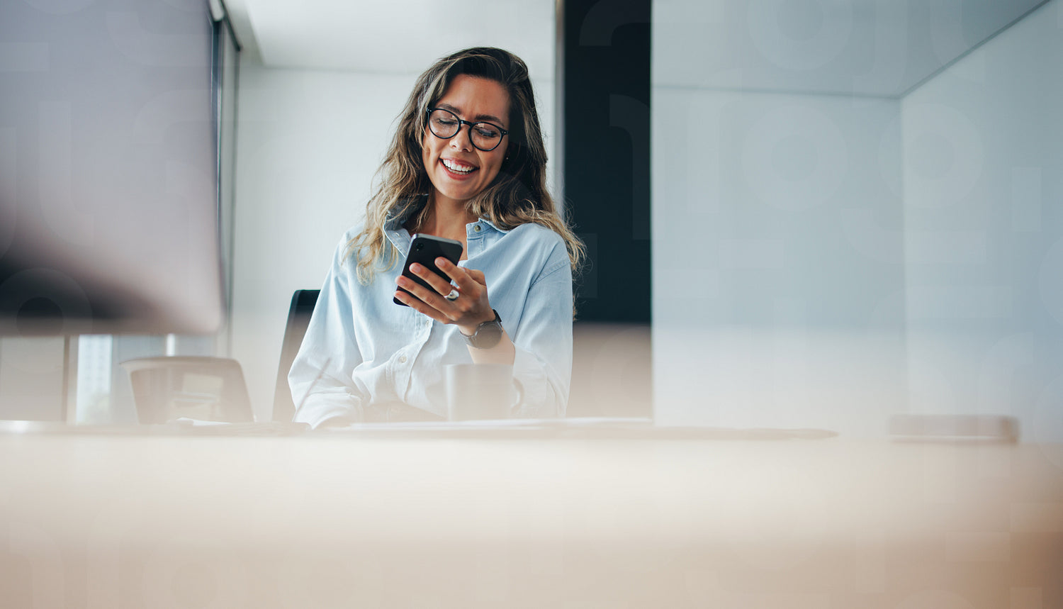 Smiling female professional wearing formal attire uses her phone at her desk in the office. Young business woman using a mobile app and smart technology to coordinate her tasks at work.