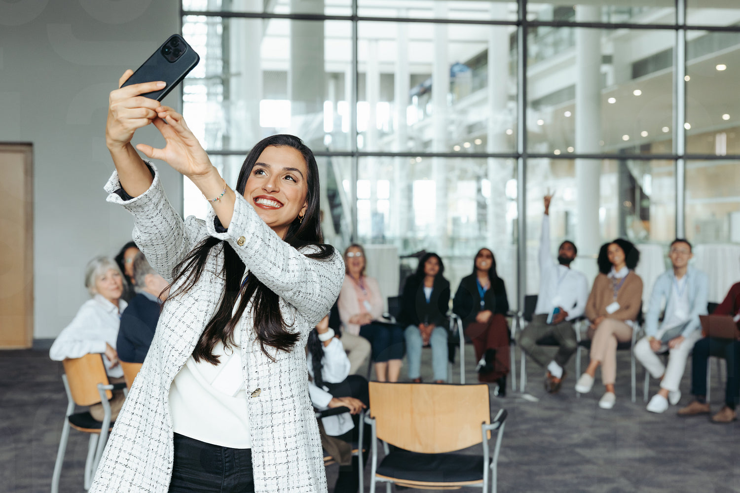 Female speaker taking selfie with diverse audience during a business seminar. Engaging and lively atmosphere in a modern conference setting.
