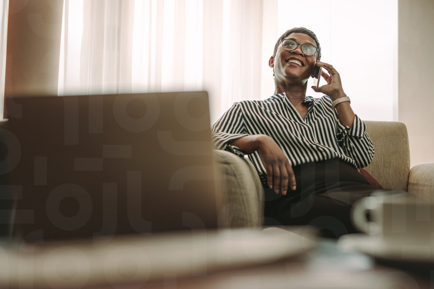 Mature businesswoman sitting on couch and talking on phone in hotel room. Woman in formal clothes relaxing in hotel room and making phone call.