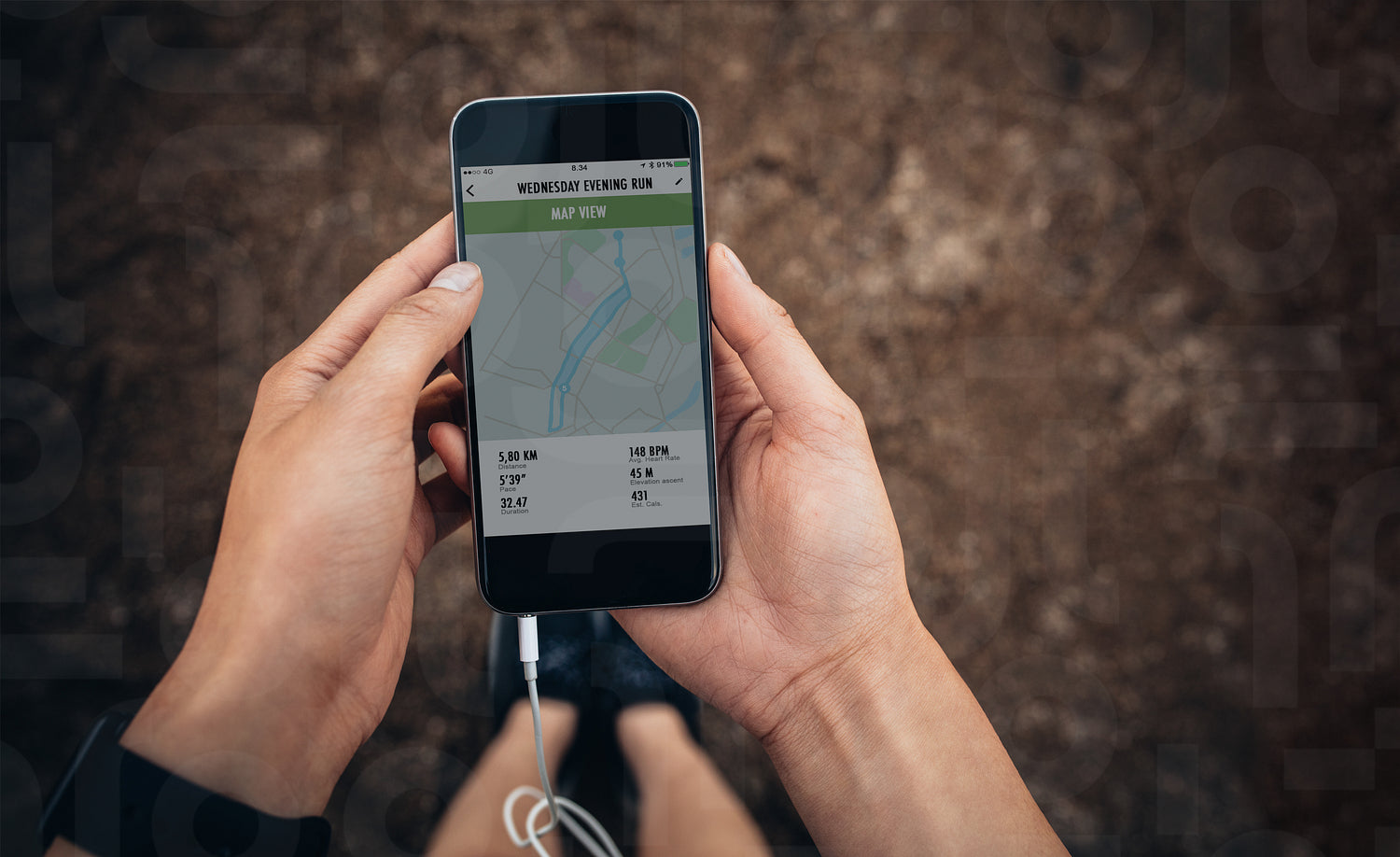Close up shot of female checking the summary of her run on mobile phone. Woman runner using a fitness app on her smartphone. POV shot with focus on cellphone in hands.