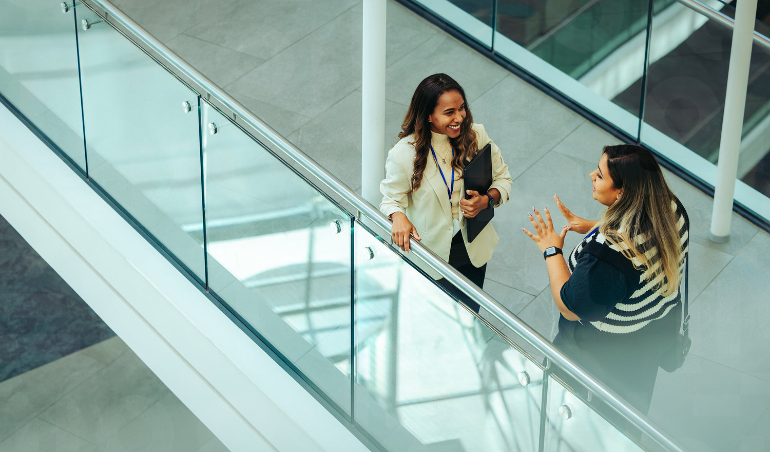 Two female colleagues are seen having a lively discussion in a modern office atrium. The setting features sleek glass railings and a spacious interior, indicating a professional environment.