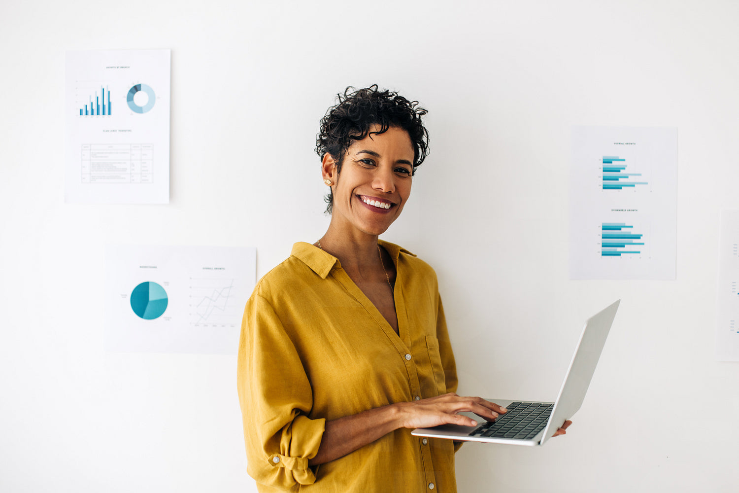 Female data analyst standing in an office and using a laptop. She is looking at the camera with a smile. Data reports in the background.