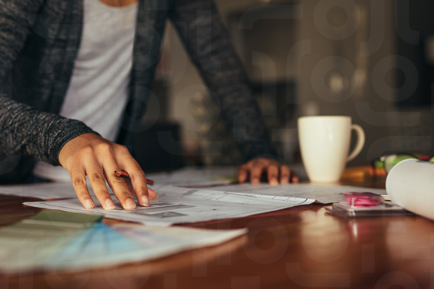 Closeup of woman hand holding pencil working on new plan at office desk. Female designer working on architect project.