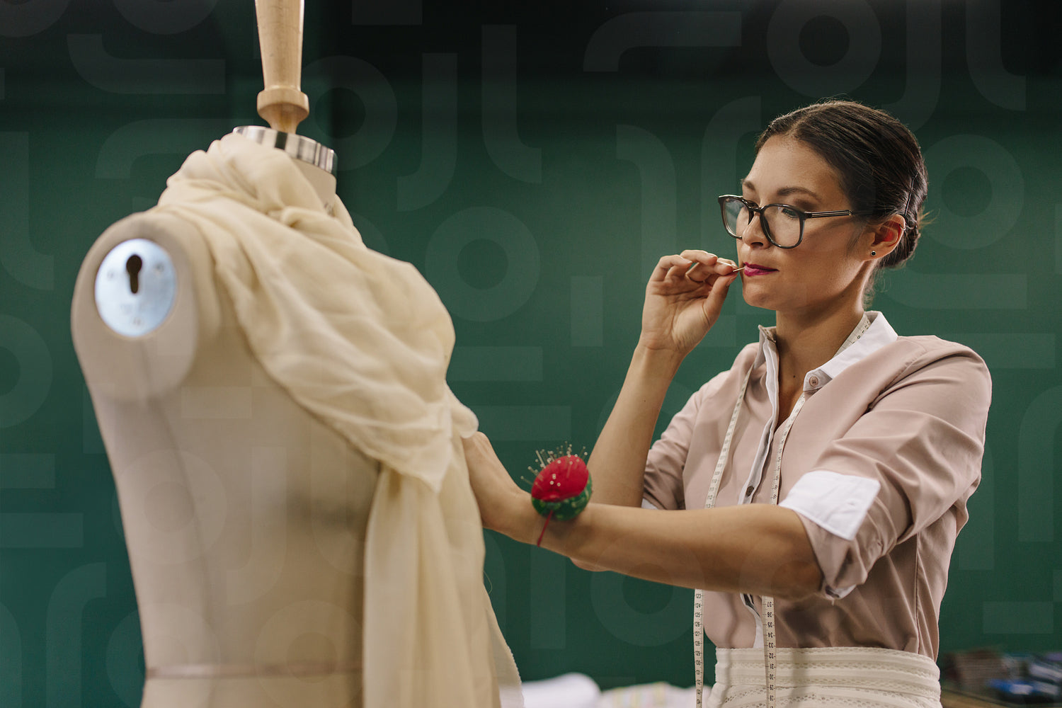 Asian female designer working on mannequin. Woman tailor placing needles on a dress in studio.