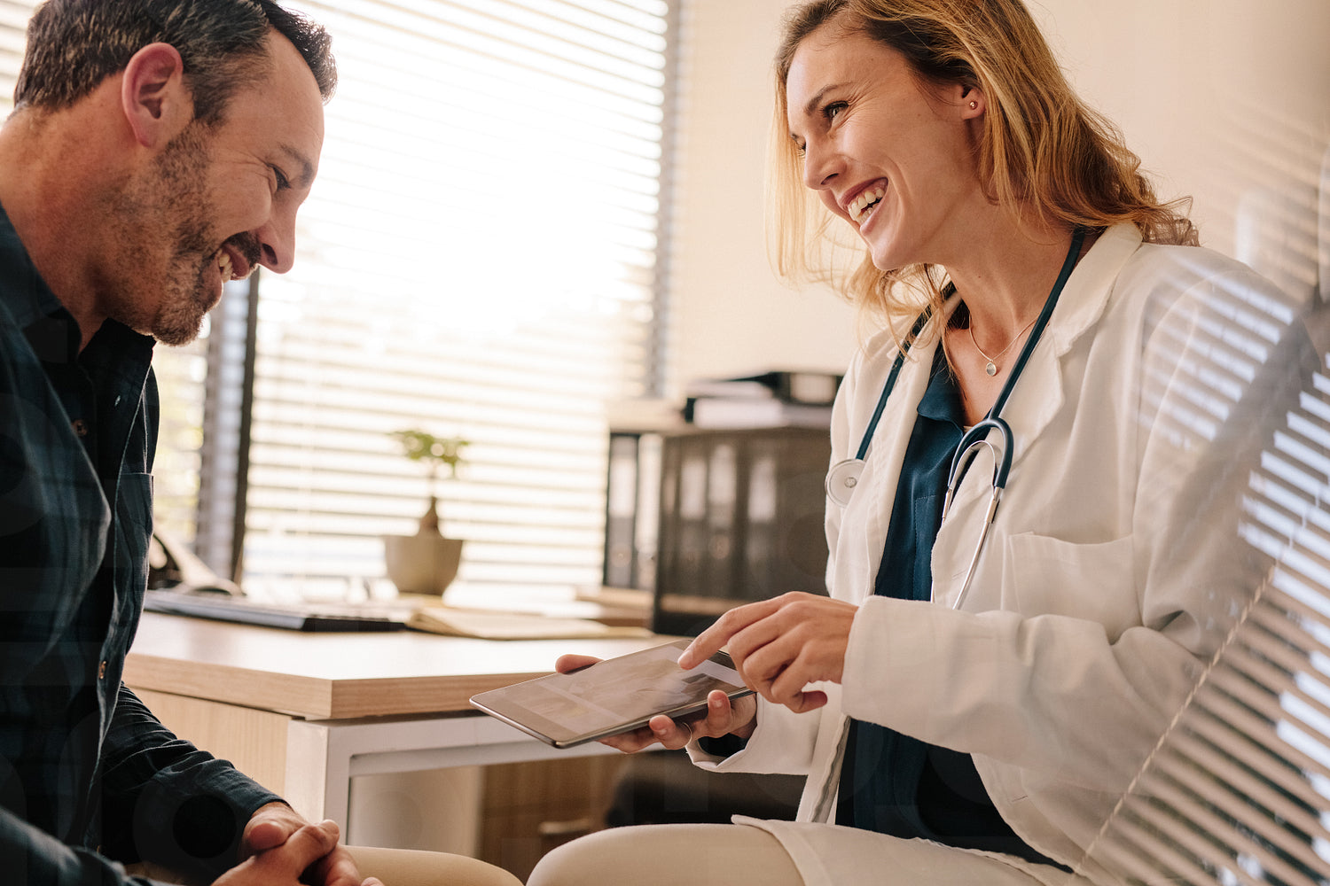 Female doctor showing good test results to a male patient. Smiling medical professional sharing good test results with her patient.