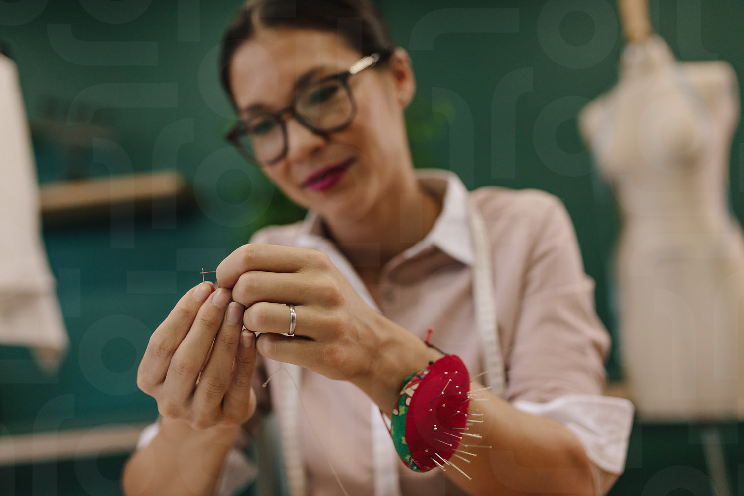 Young dressmaker woman putting sewing thread through needle. Asian tailor woman designer threading the needle.