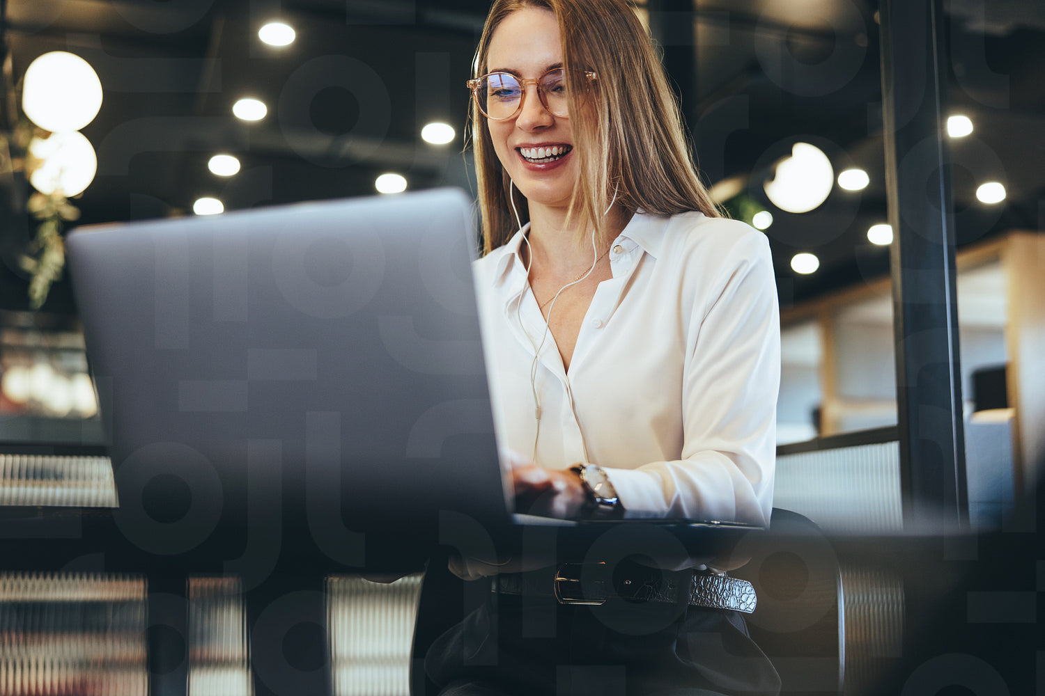 Female entrepreneur taking a video call in an office. Happy young businesswoman smiling while using a laptop and wearing earphones. Cheerful businesswoman sitting at a table in a modern workspace.