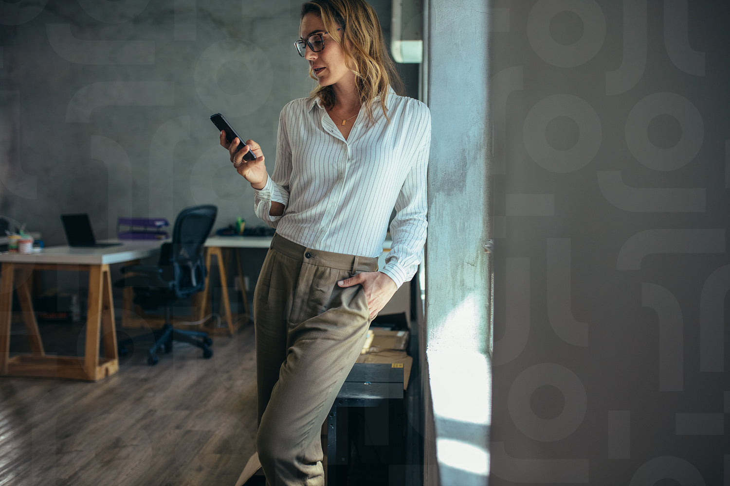 Businesswoman standing in office and using her smart phone. Female entrepreneur looking at her mobile phone.