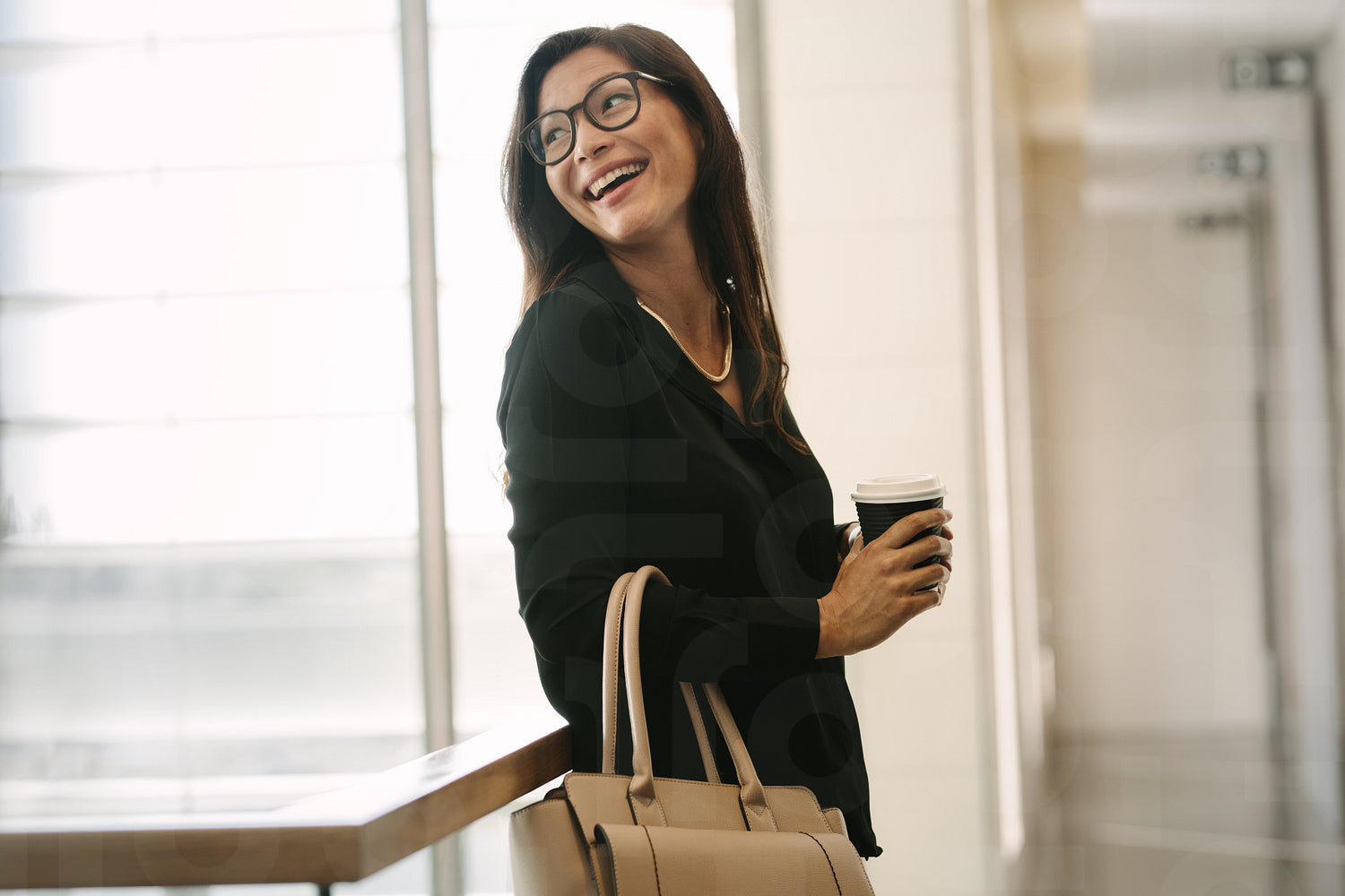 Smiling business woman standing in office with cup of coffee . Female executive standing in office during break.