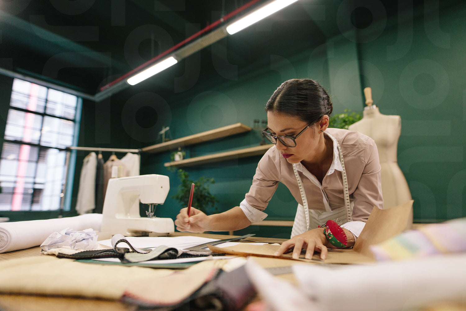 Asian fashion woman designer drawing design sketch. Female designer working in her fashion studio.