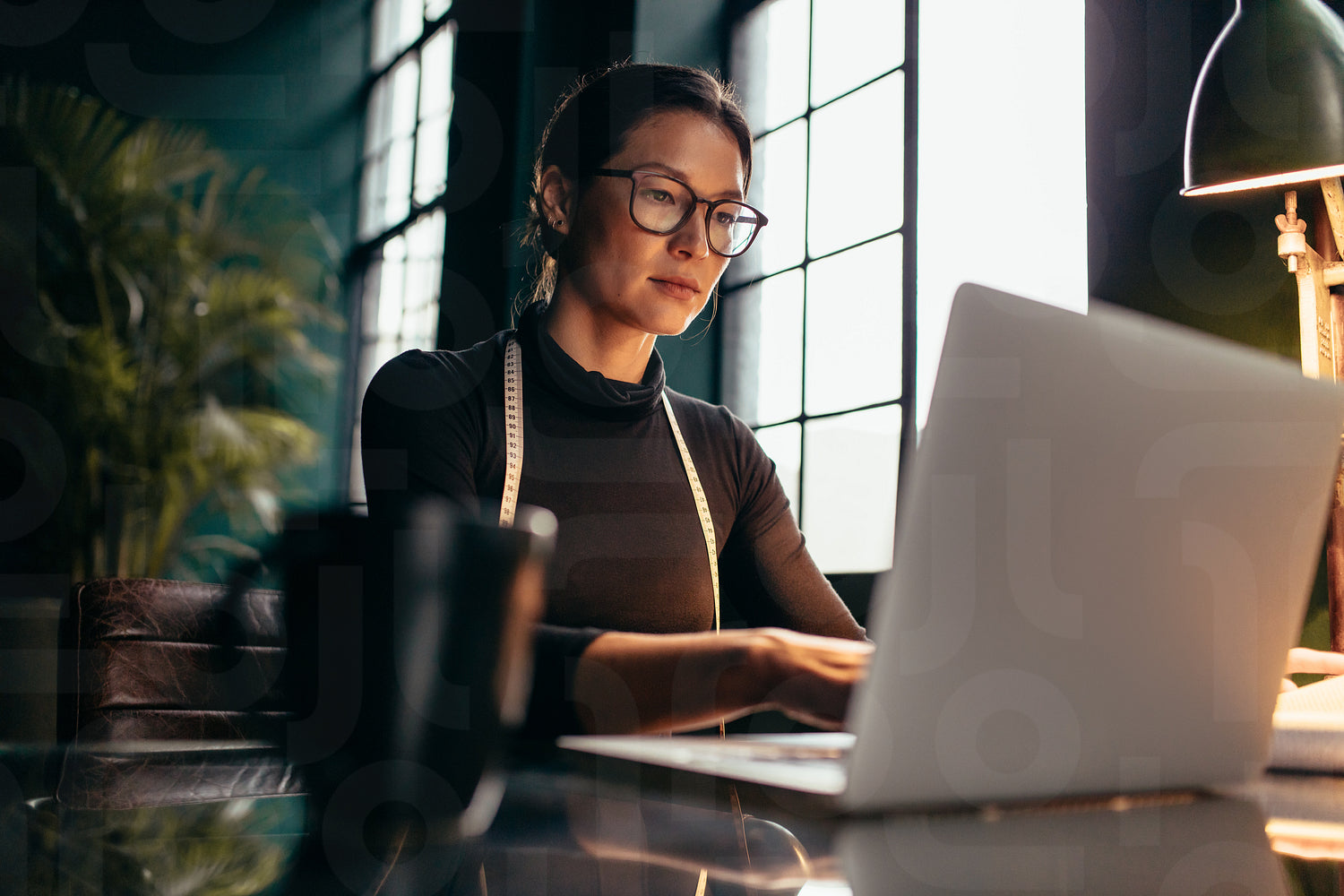 Female fashion designer working on laptop in studio. Asian female creative professional using laptop in office.