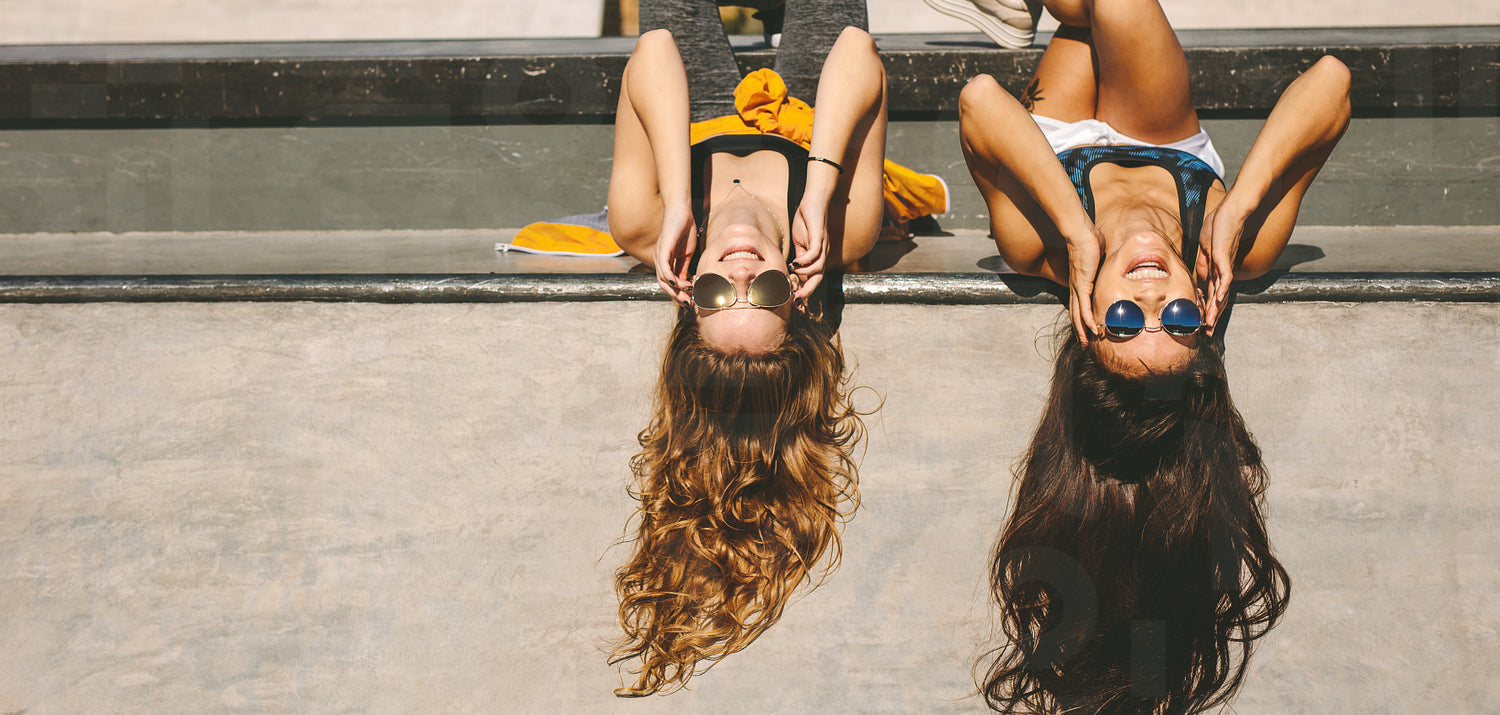 Two stylish girls lying down at skate park with sunglasses. Female friends having fun at skate park on a summer day.