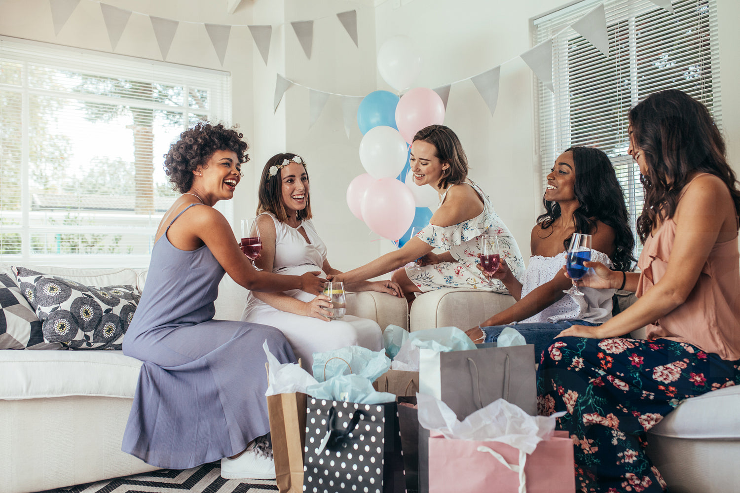 Group of multiethnic female friends attending baby shower at home. Friends touching baby belly of pregnant woman.