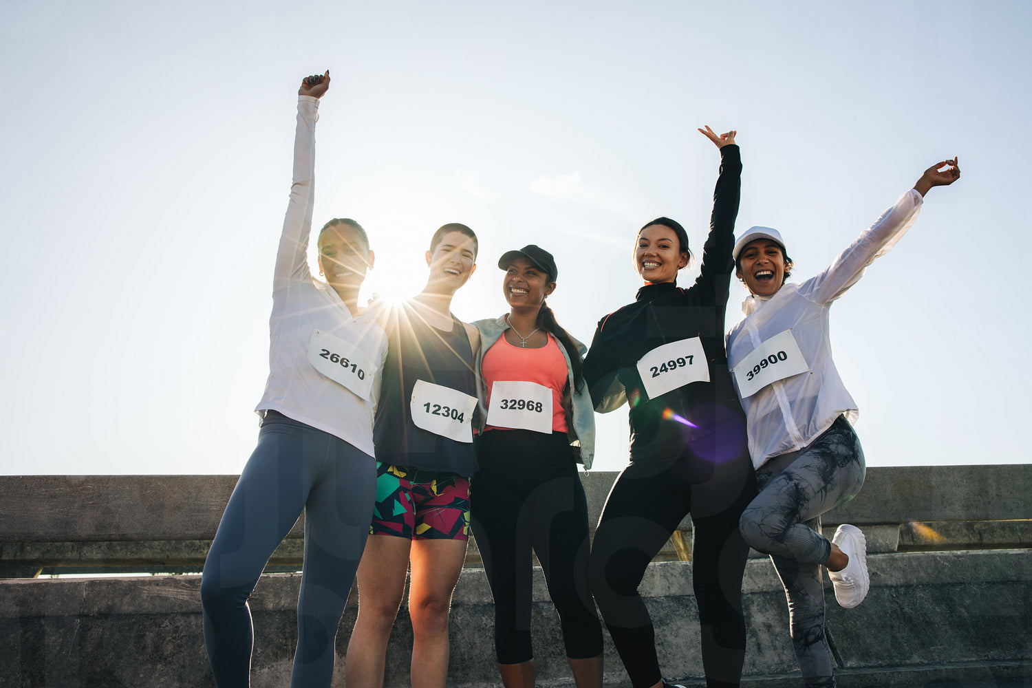 A group of diverse female friends celebrates afte a road race. They stand together with race bibs, arms raised victoriously, capturing the spirit of friendship, teamwork, and achievement in sports.