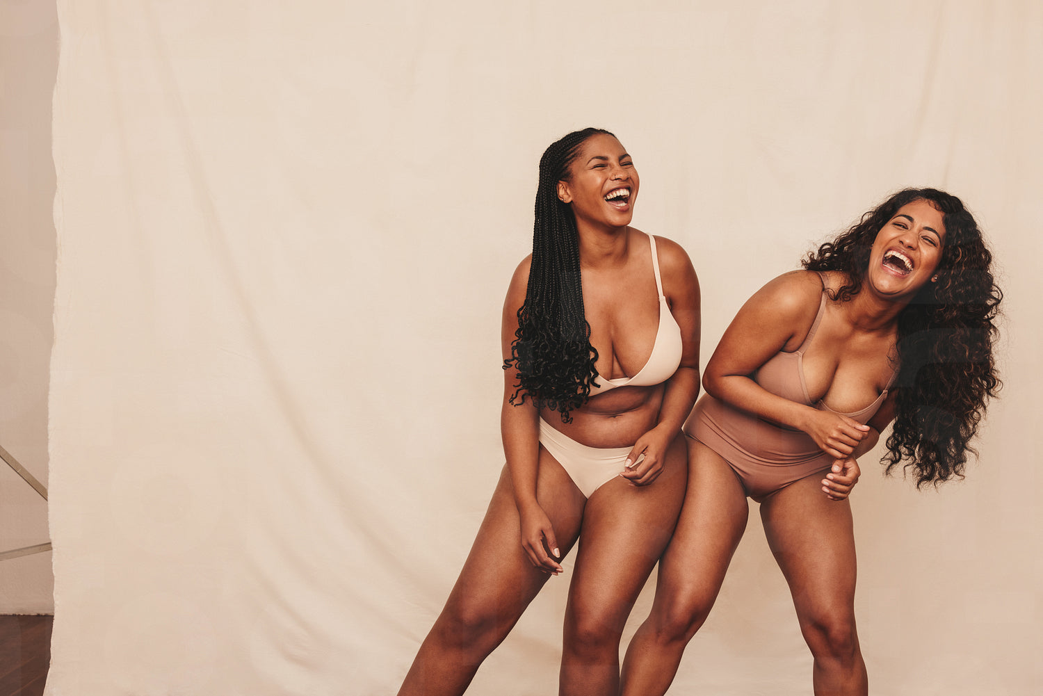 Female friends dancing cheerfully while wearing underwear. Two body positive young women celebrating their natural bodies against a studio background. Two women feeling comfortable in their bodies.