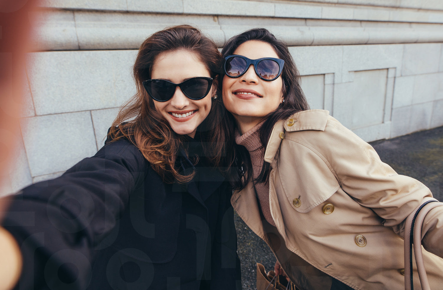 Female friends making a self portrait in the city