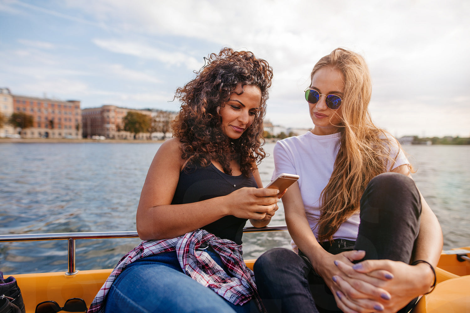 Shot of two young women sitting on boat and looking at mobile phone. Female friends using smart phone by the lake.
