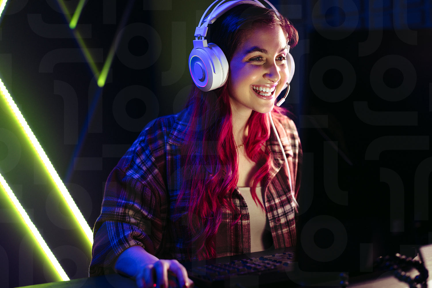 Female gamer dominating a single-player game online, expertly navigating the virtual world on a computer. Happy young woman smiling as she plays a video game, her passion for gaming on full display.