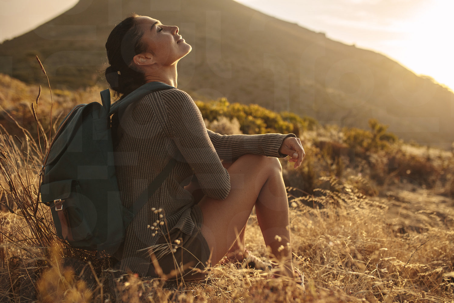 Young woman hiking in countryside sitting and taking rest. Female hiker resting on dry grass field.