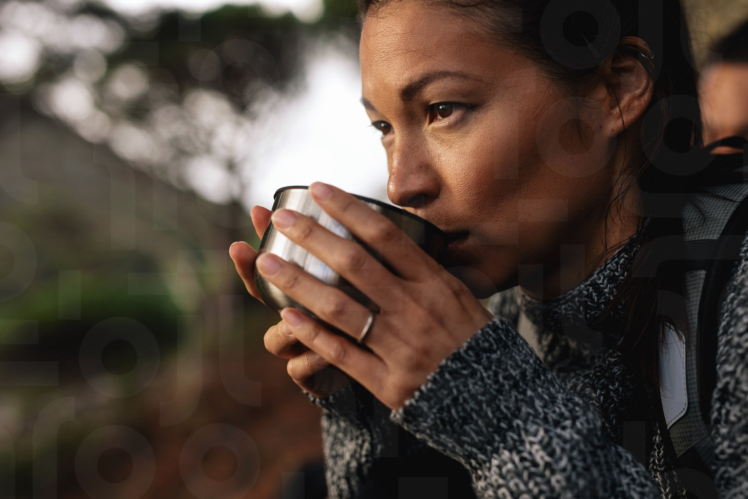 Close up shot of young asian woman drinking coffee, taking break during hiking. Female hiker taking rest on mountain hill.