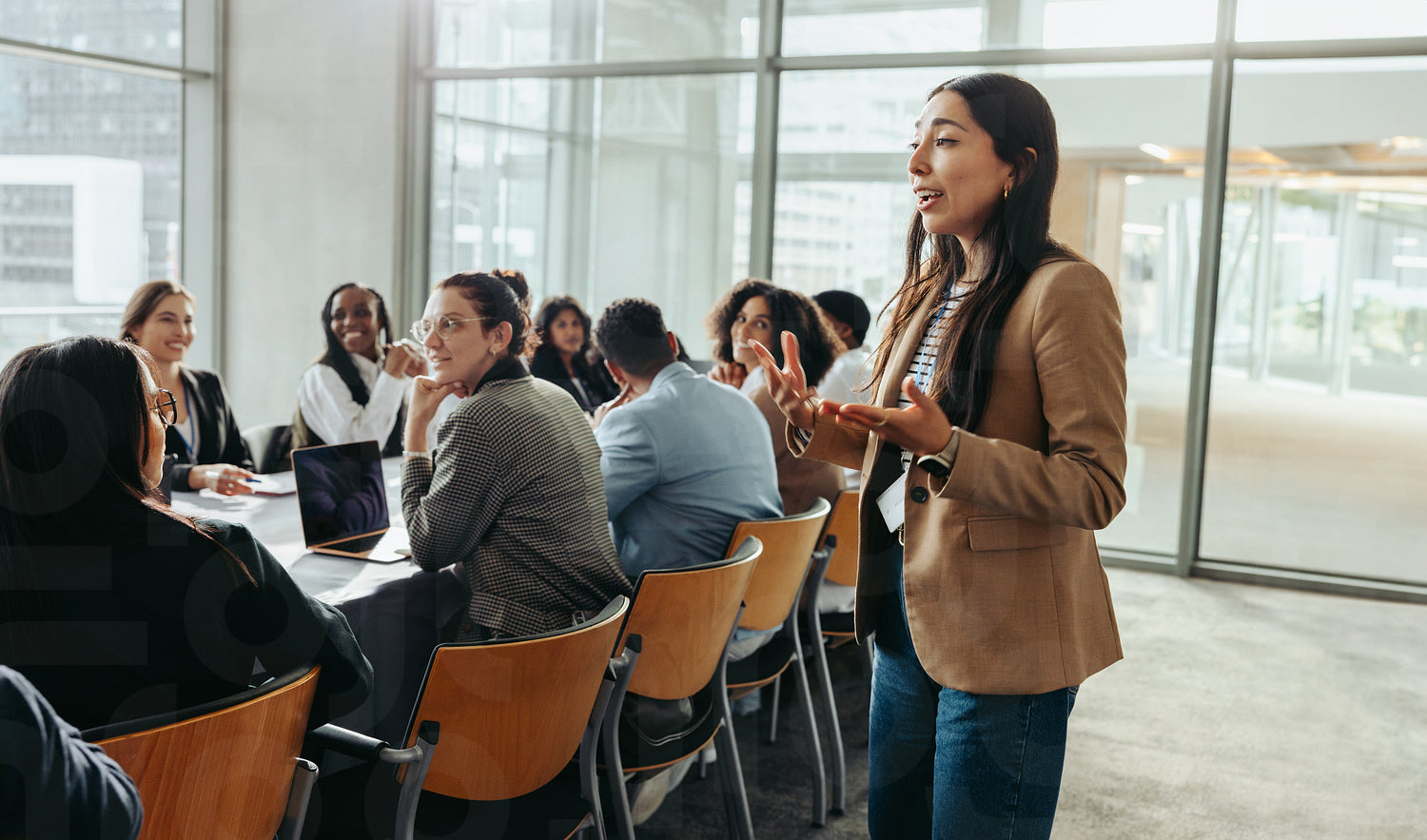 Female leader conducting a workshop with a group of professionals in a modern office space