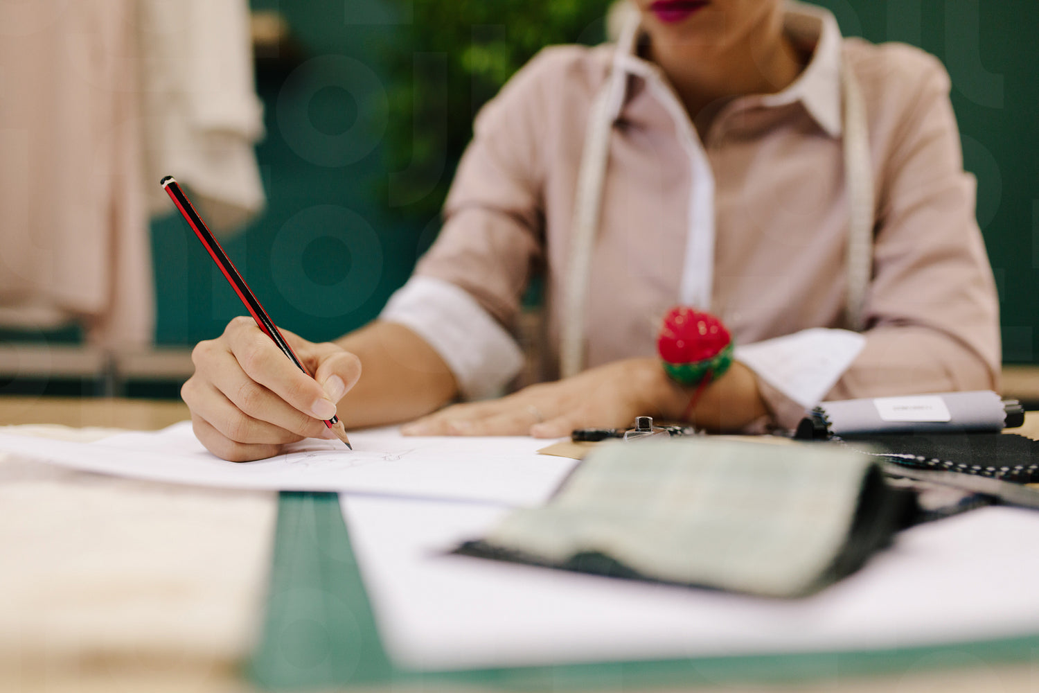 Fashion designer drawing dress design sketch on paper. Female hand making a drawings on paper at dressmaking studio.