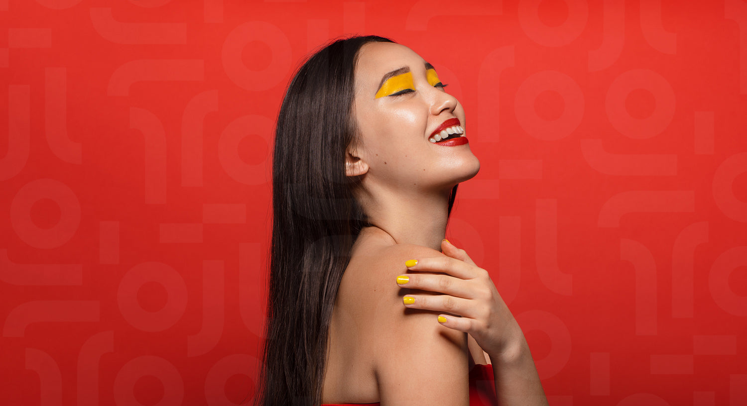 Elegant woman with stylish stage make up smiling on red background. Asian female model with creative make up.
