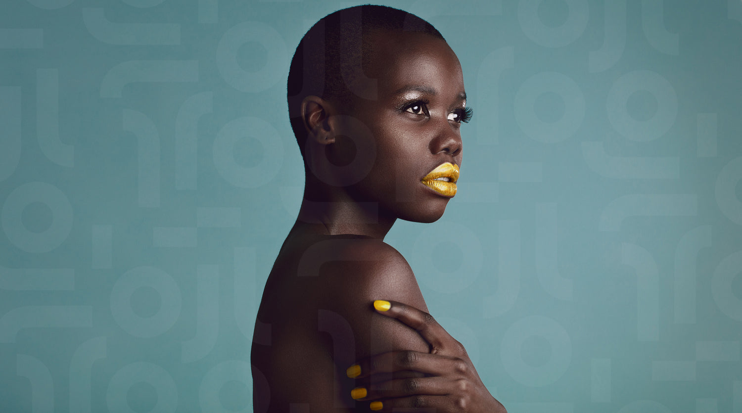 Close up of a beautiful woman with golden yellow nailpaint and lipstick makeup. Beauty portrait of female model with vibrant makeup on grey background.