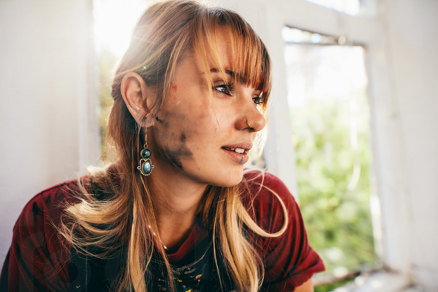 Close up shot of beautiful young woman with paint on her face. Female painter looking away.