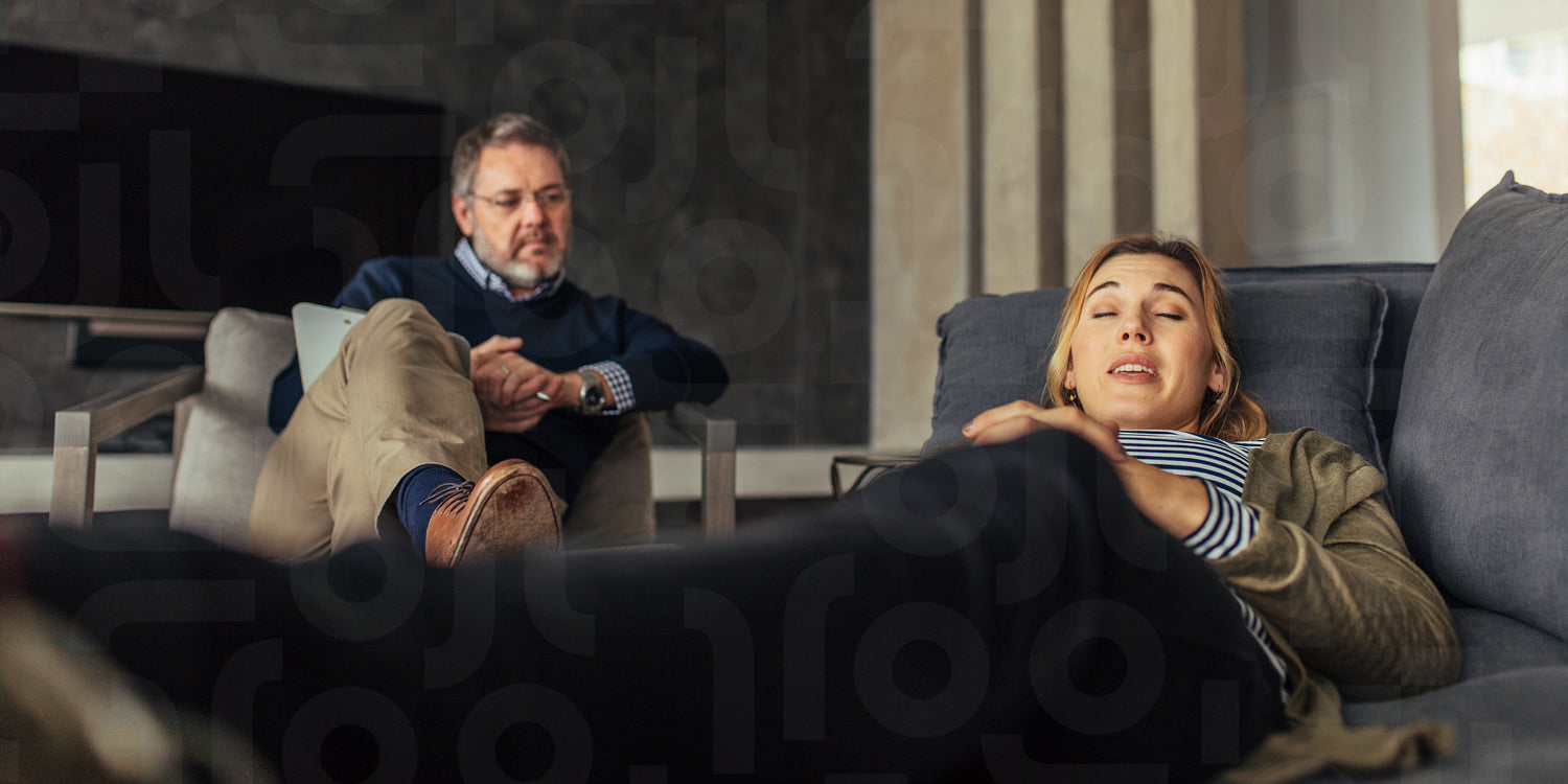 Depressed woman lying on couch during psychotherapy session. Female patient discussing her issues with psychologist during therapy.
