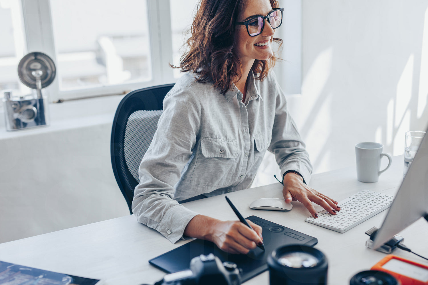Young female photographer working on computer using drawing pad at office desk. Young caucasian woman using digital graphic tablet and drawing pen to retouch the images.