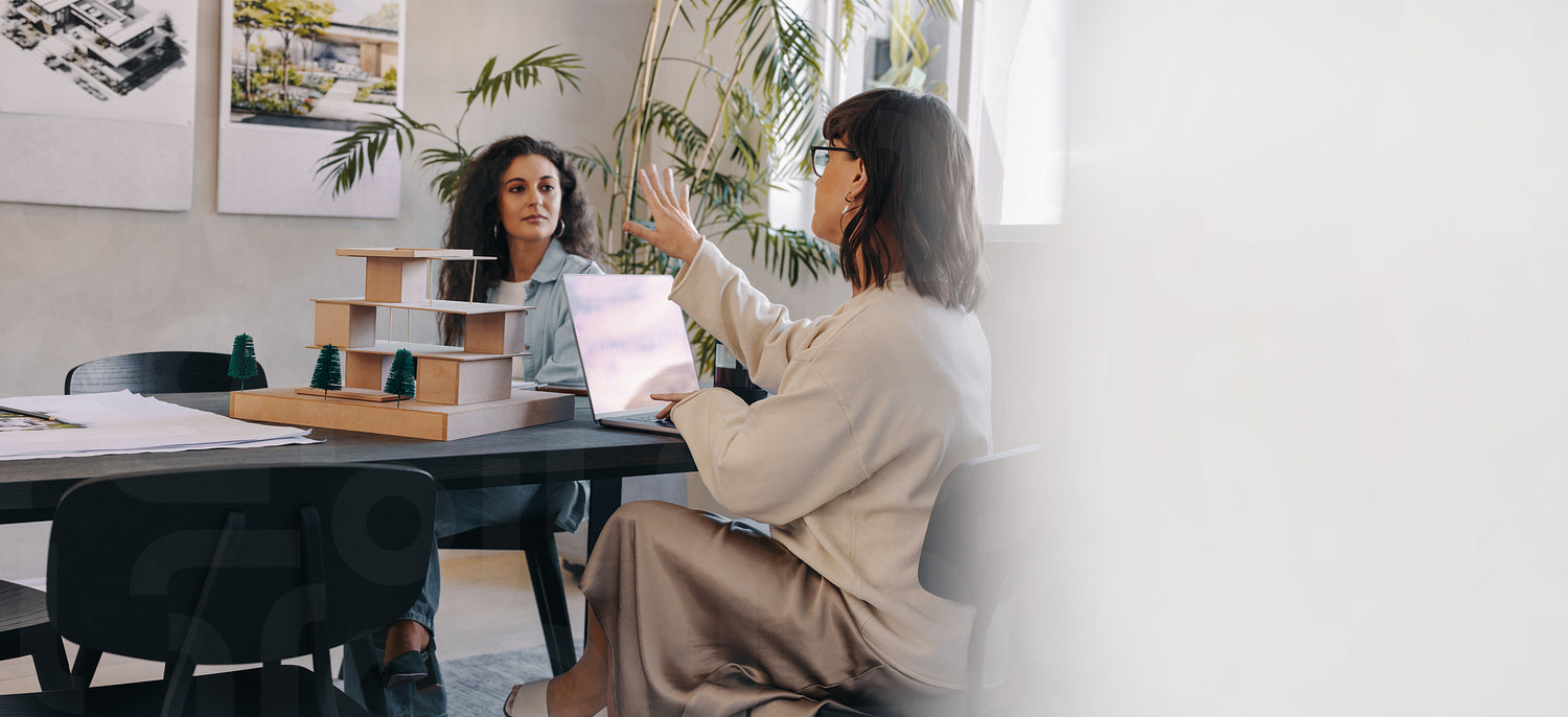 Two female professionals engage in a project management discussion in a contemporary office. Their focus is on strategy and teamwork, creating an inspiring professional environment.