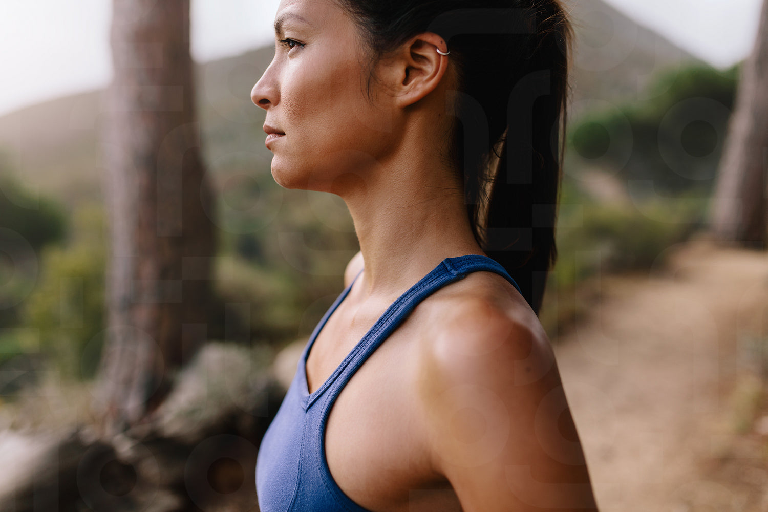 Close up shot of healthy young woman standing outdoors and looking away. Confident female runner in sportswear in morning.