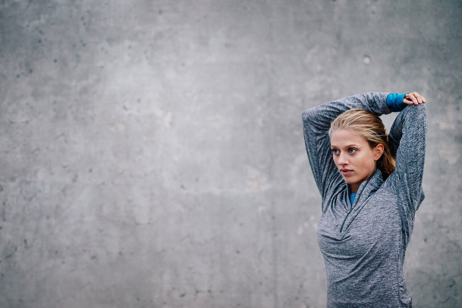 Female runner stretching arms after a running session. Young sports woman against grey background looking away.