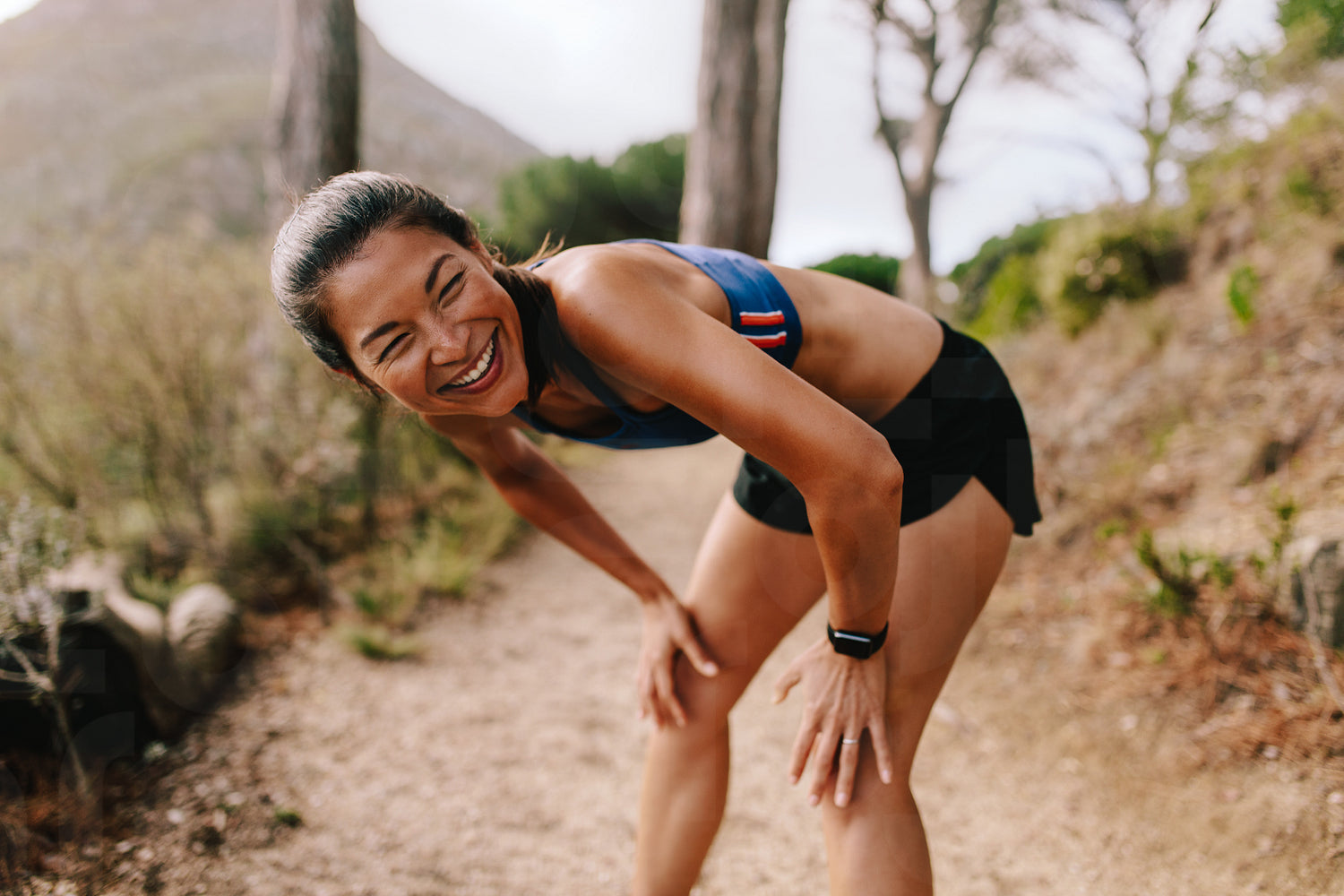 Fit young asian woman standing on mountain trail with her hands on knees and smiling. Female runner in sportswear taking a break after running workout.