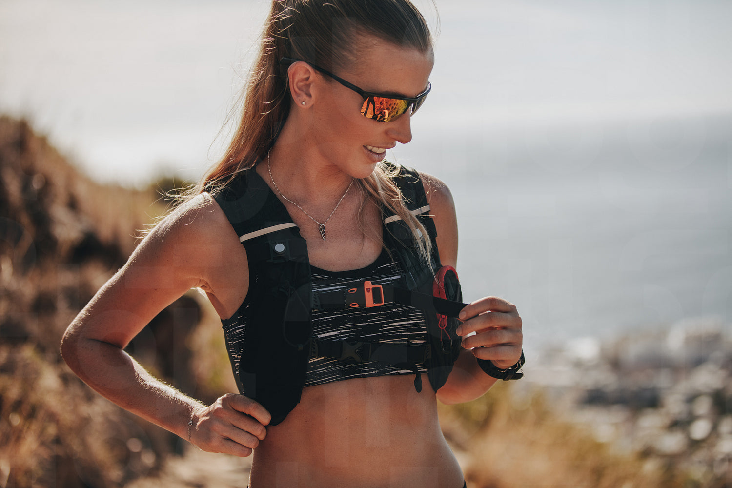 Close up portrait of healthy young woman standing outdoors on a mountain trail. Confident female runner wearing sunglasses taking break while training.