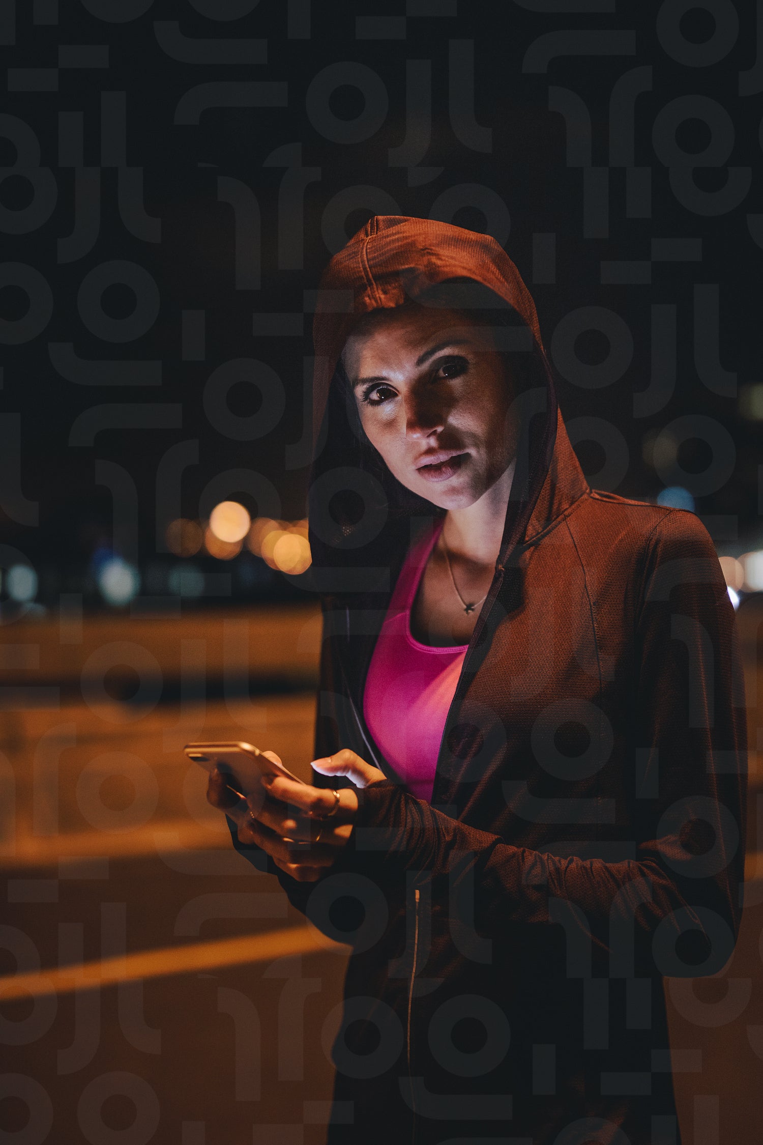 Fit young woman in hooded shirt standing outdoors with mobile phone. Female runner taking break after workout outdoors at night.