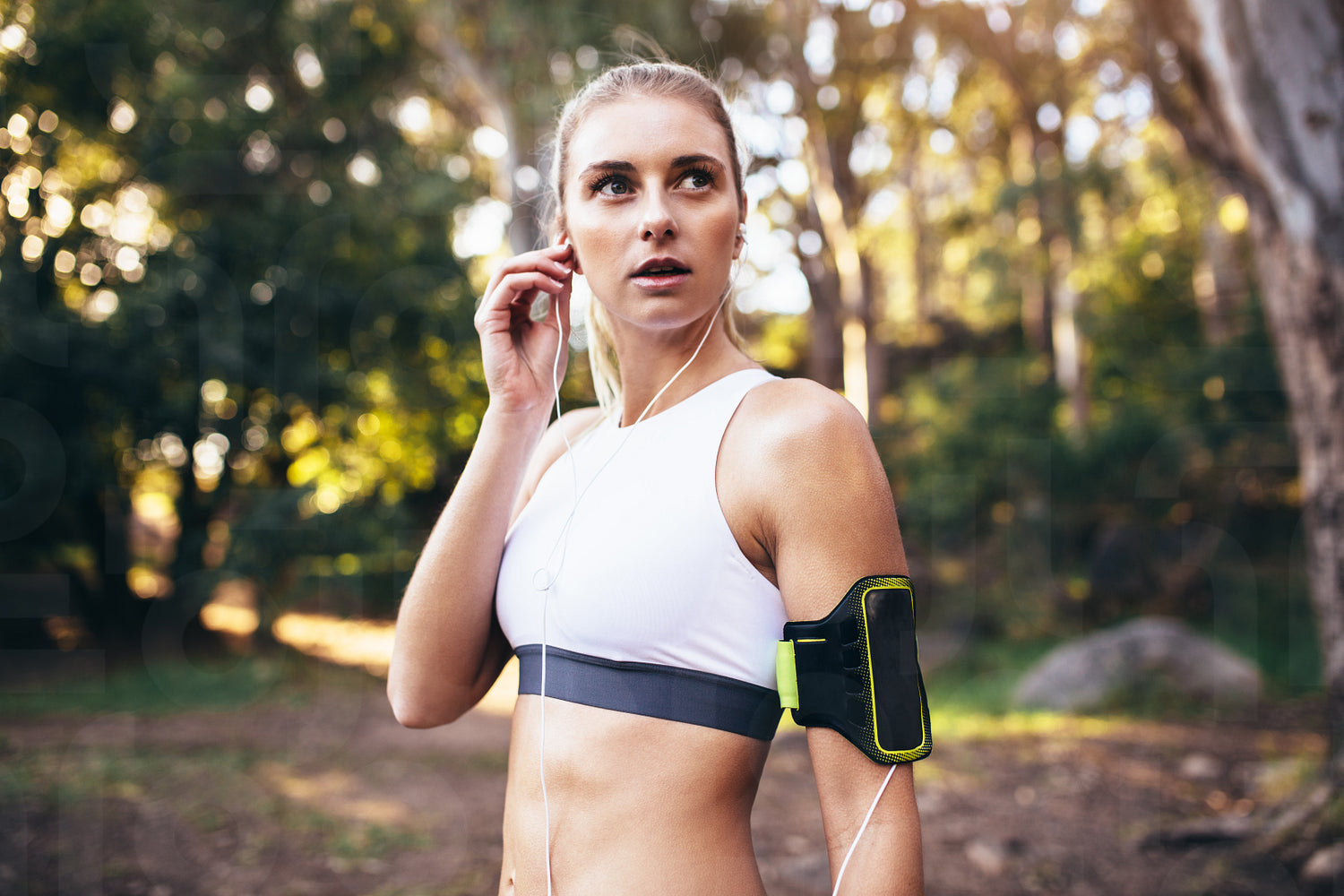 Woman wearing earphones looking away. Runner listening to music during morning jog.