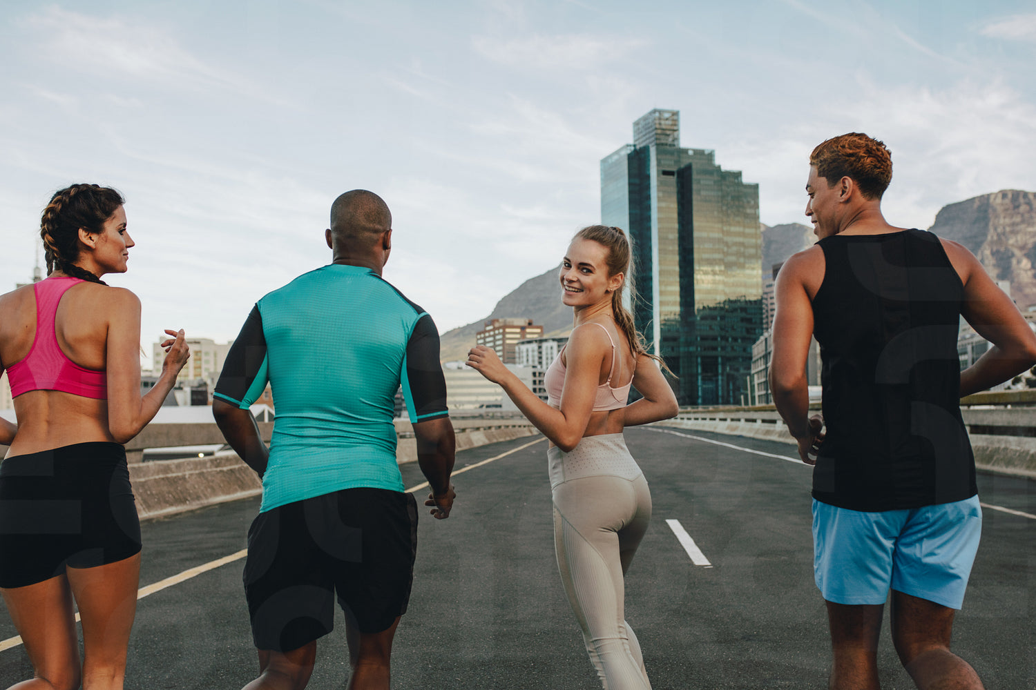 Woman running with her group of runners outdoors. Female exercising with friends outdoors in the city. Girl looking over shoulder while running outdoors.
