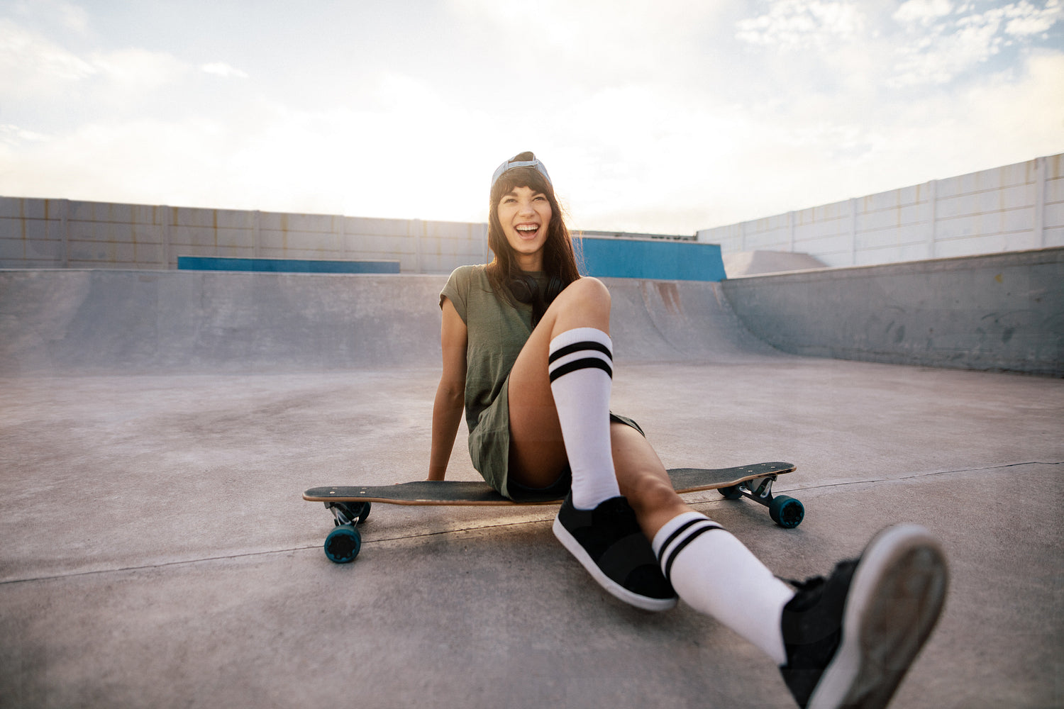 Smiling woman skateboarder sitting on her long board. Female skater having fun at skate park.