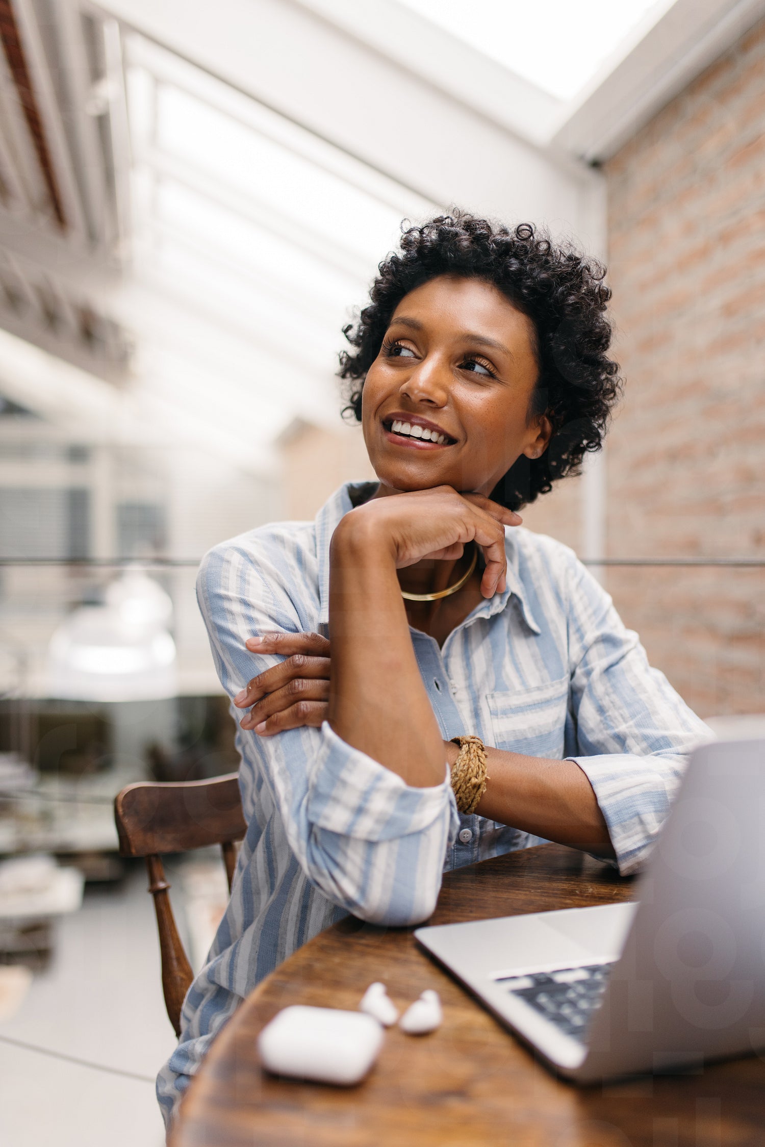Female small business owner looking away thoughtfully in a warehouse. Happy entrepreneur contemplating new creative ideas for her business. Cheerful businesswoman running an online startup.