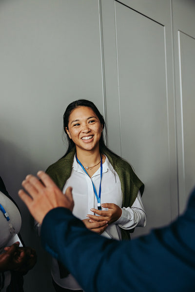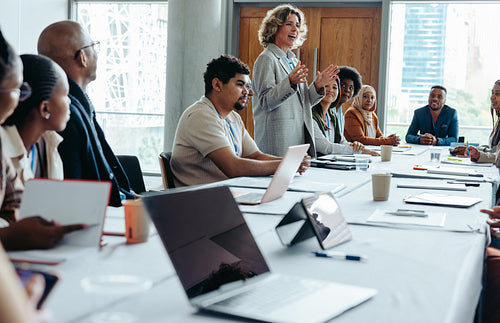 Female speaker giving a presentation during a business seminar, focusing on leadership and training in a modern conference room.